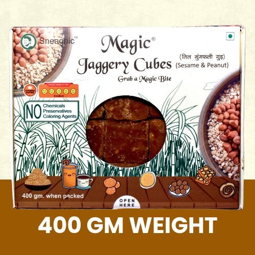 Satisfy your sweet cravings the healthy way with Magic Jaggery (Peanut Sesame Flavour) – 400 GM Box. Made from the finest sugarcane jaggery and naturally blended with roasted peanuts and sesame seeds, this wholesome treat is not only irresistibly delicious but also loaded with health benefits.